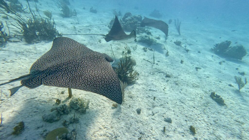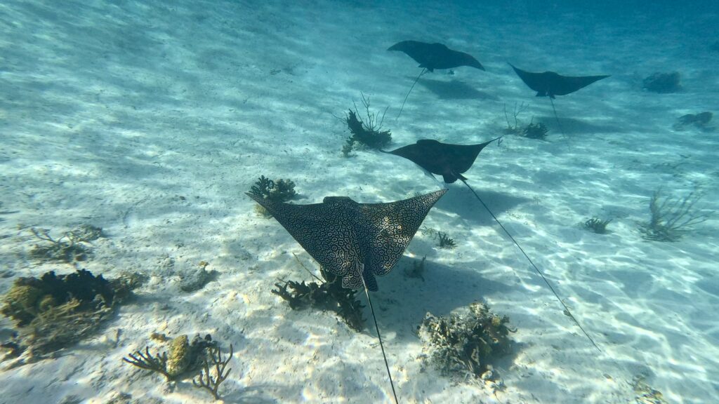 Peu de monde à la bouée à Warderick, seulement 1 autre bateau, incroyable ! . Et c’est un festival qui attend notre virée en dinghy, 4 magnifiques raies léopard évoluent gracieusement devant pour le plus grand bonheur de la Go Pro qui était de sortie.