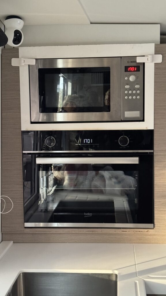 Pratique quand même de ranger tout cela au milieu du champ de mine qu’est le bateau : coffres extérieurs ouverts qui ne te permettent pas de passer comme tu veux , outils de bricolage trainant partout pour cause de réparations diverses et variées, planchers intérieurs ouverts pour mieux te piéger mon enfant ; et, avec le sourire, tu dois trouver la place pour tous tes achats en jouant au Tetrix dans les placards et tout recommencer encore et encore quand tu découvres que tu as oublié des boîtes sur le côté (je passe alors les jurons) . Que celui qui n’a jamais connu tout cela me jette la première pierre.