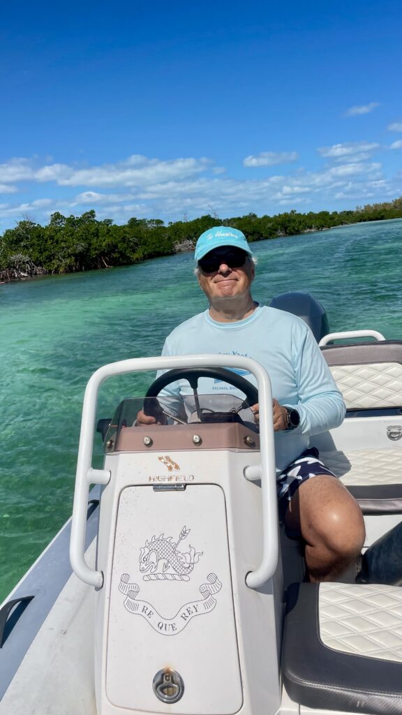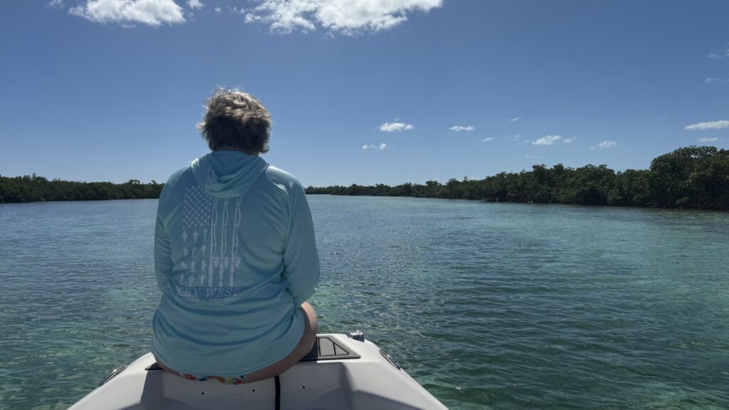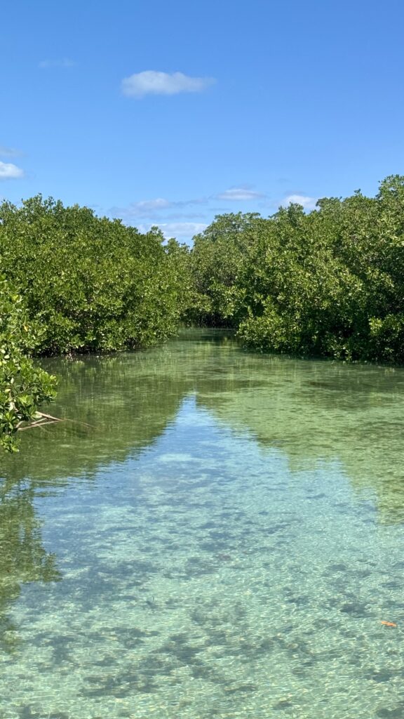 La journée s’annonce très belle. Il fait un peu frais mais ce n’est certes pas pour me déplaire, au contraire. Le ciel est bleu, la mer est ridée, le soleil brille. Ca y est, enfin ! une journée bahamienne ordinaire et … tant attendue. On chausse le maillot de bain (ben nâan hein ! pas le même, chacun le sien !), on affute les chaussures d’eau, on met le carrosse à l’eau et hop nous voilà partis direction la rivière enchantée, savoir, un petit tour dans les méandres de la mangrove voisine. Nous sommes telles les belettes moyennes sortant de leurs trous le printemps revenu.