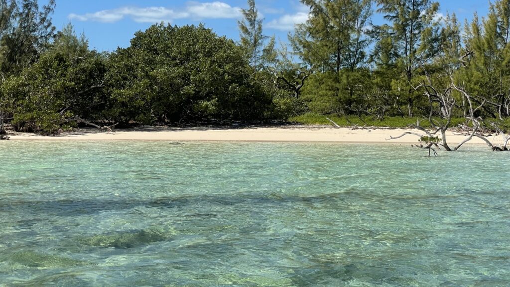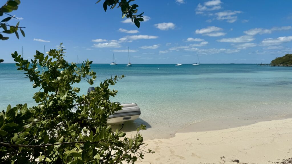 Tout y est si calme et silencieux sauf lorsque l’on se rapproche de l’océan de l’autre côté qui donne un bruit de fonds d’autoroute tant les vagues claquent sur la surface de la mer. C’est d’ailleurs la raison pour laquelle nous avons décidé de rester ici aujourd’hui plutôt que descendre un peu plus bas vers Marsh Harbour. En effet, il nous faudrait ressortir du « lagon » entre la grande île des Abaco et le chapelet d’ilets à l’Est de celle-ci et chevaucher les vagues de l’océan prévues en ce jour à plus de 1,70 mètre . Nous aurions aussi pu prendre un chemin à travers le lagon mais celui-ci est très risqué du fait de sa très faible profondeur qui ne se laisse pratiquer qu’à marée haute. Alors nous ne cherchons pas les ennuis et décidons de jouir pleinement de cette première vraie journée telle que nous l’entendons aux Bahamas au milieu de cette superbe baie turquoise, blanc, vert, triptyque synonyme de paradis, baie ayant maintenant revêtu ses plus beaux atours après la grisaille, la pluie et le vent de ces dernières 48 heures.