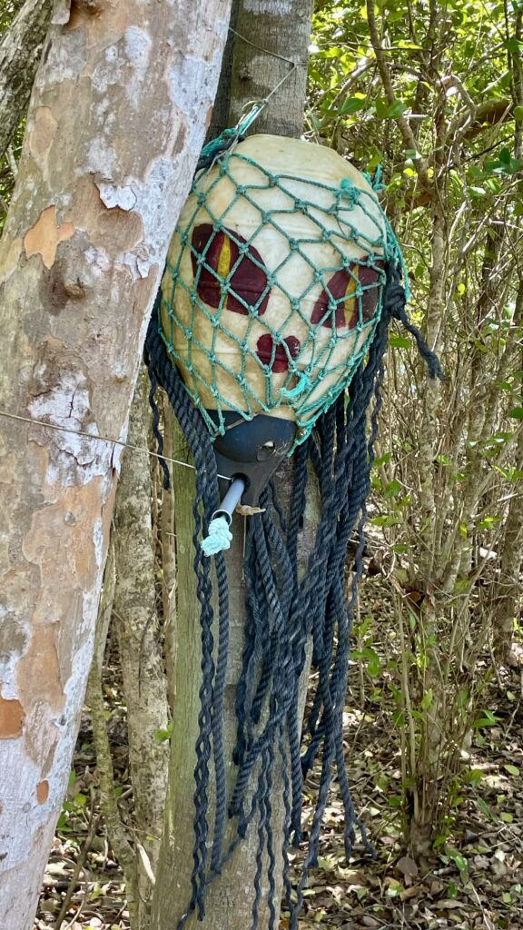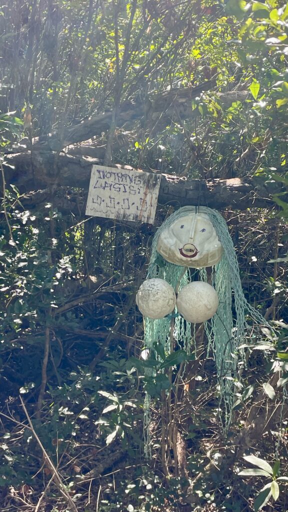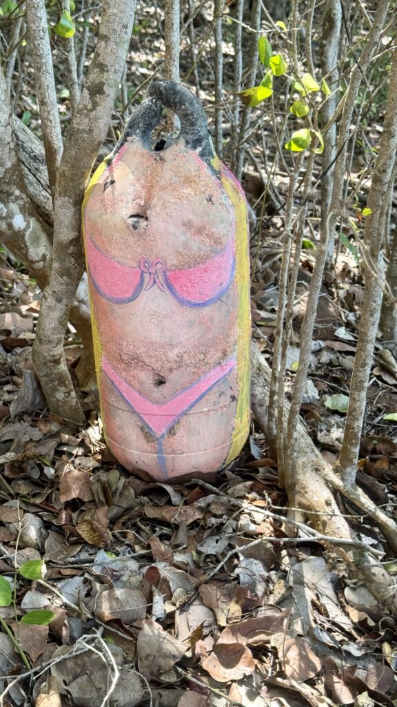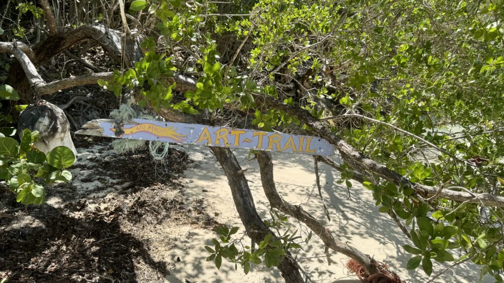 Sur la jolie plagette qui nous faisait de l’œil depuis 48 heures, nous posons nos empreintes et remontons un petit chemin tracé par l’homme au milieu des arbres. Les vestiges des tempêtes et ouragans ramenés par vents et courants ont été rassemblés par les divers plaisanciers de passage pour en faire des œuvres d’art. Le tout n’a pas à rougir face aux délires du Palais de Tokyo. Je dirais même plus, chers Dupon T et Dupon D, que ces compositions seraient dignes d’y être exposées avec une mise à prix plus chère qu’un Bansky.