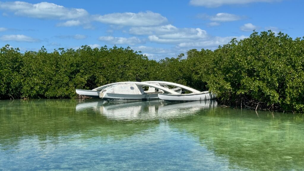 Au détour d’un méandre, seul dans la mangrove, un trimaran démâté et abandonné, vestige d’une autre vie, d’autres rivages, quelle est son histoire ? Où vont les tortues mortes ? L’eau est transparente, on dirait que nous sommes en lévitation sur les fonds sablonneux, telles sont quelques unes des réflexions qui traversent mon esprit pendant que, chemin faisant, cahin caha, deci delà , je savoure ces instants.