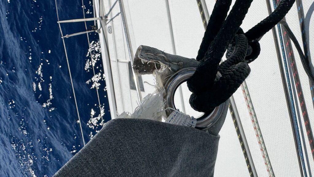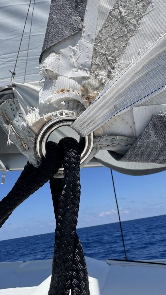 Mauvaise nouvelle : le point d’écoutes de l’italien (la boucle en bas du génois dans laquelle passent les 2 bouts de corde pour tirer dessus à droite ou à gauche) est en train de se déchirer et ne tient presque plus que par un fil.