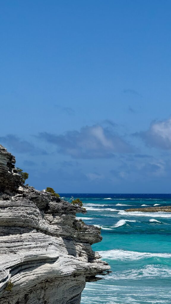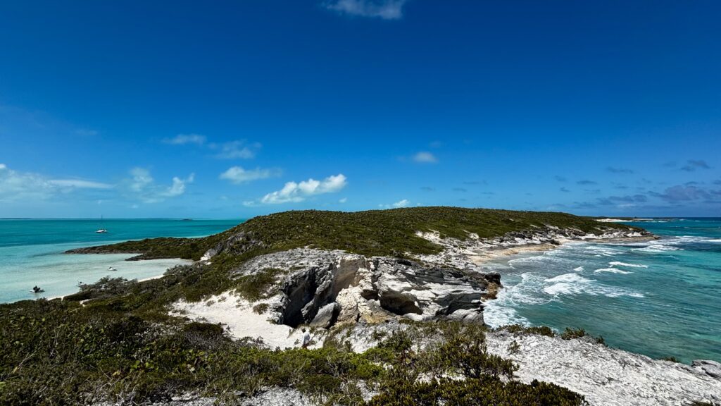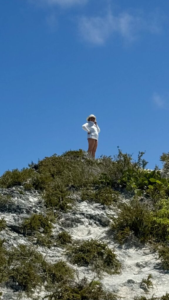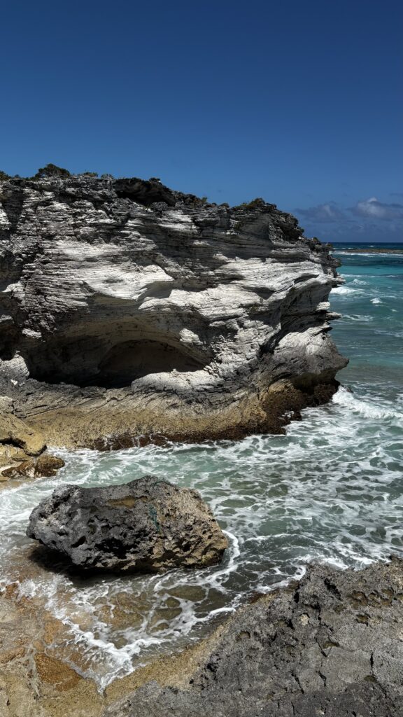 Nous montons sur 100 mètres en haut de la colline pour admirer le paysage à 360 degrés. D’un côté l’océan tout en vagues tantôt bleu nuit tantôt bleu roi tantôt bleu lagon avec ses vagues blanches qui tranchent sur ce tapis azur et de l’autre côté le turquoise clair lagon devenu calme . C’est magique et si reposant. Zen attitude !